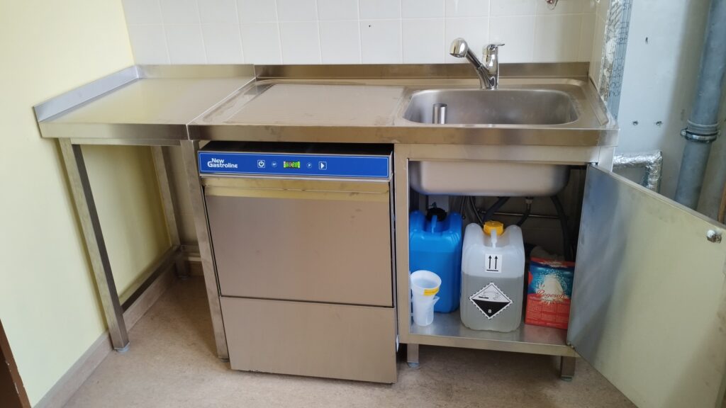 Ein weiterer Pluspunkt: Sicherheit und Hygiene wurden gleichermaßen berücksichtigt. Das Spülmittel ist im abgeschlossenen Unterschrank untergebracht und somit zuverlässig vor unbefugtem Zugriff – ein wichtiger Aspekt im schulischen Umfeld mit jungen Kindern.