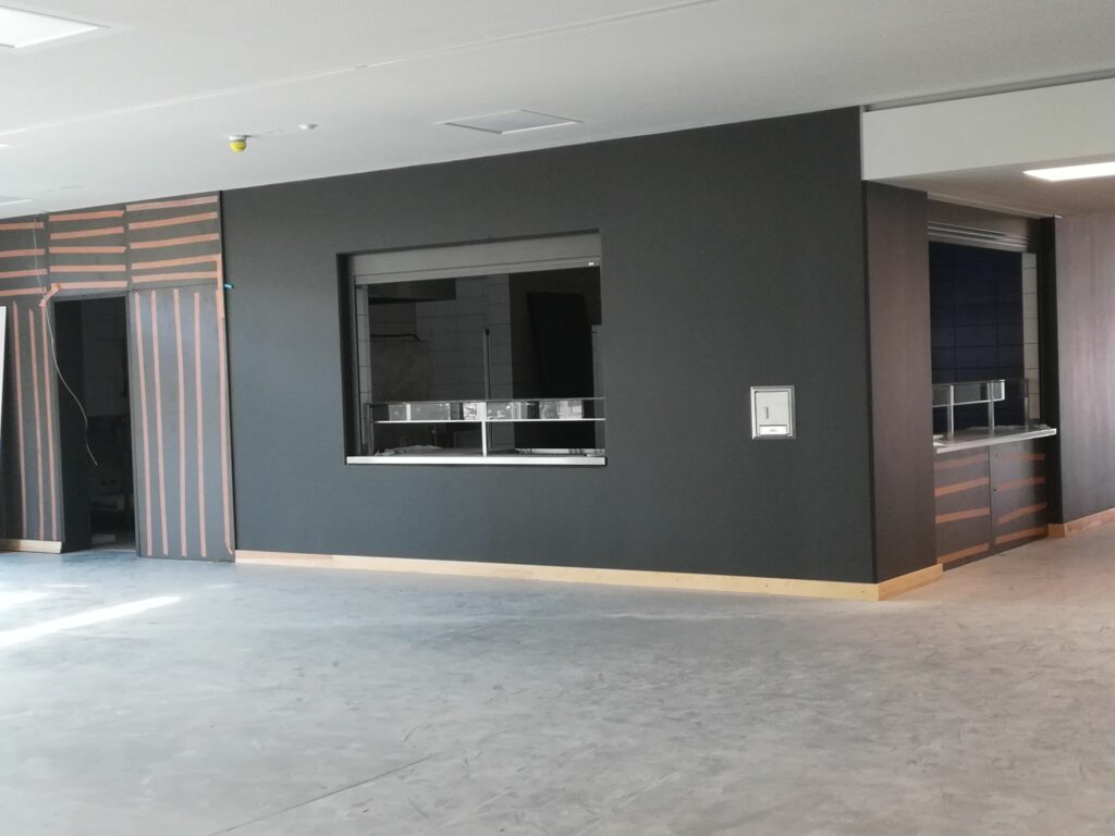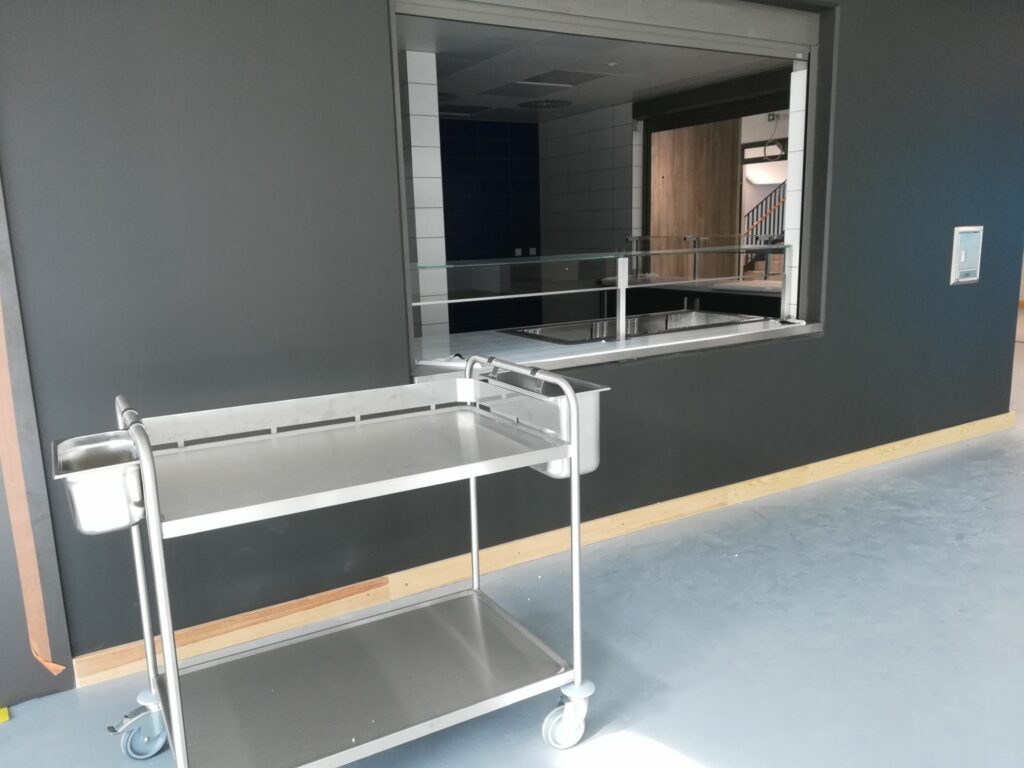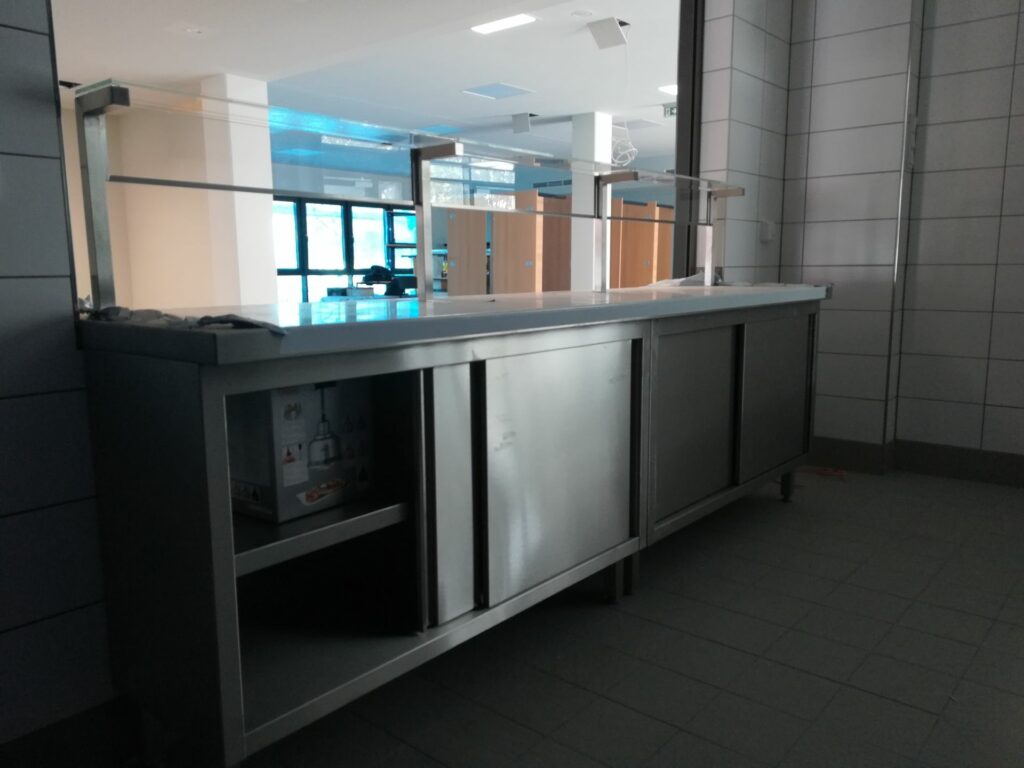 Die Ausgabe wurde in Warm- und Kaltbereiche unterteilt und mit maßgefertigten Edelstahlmöbeln im Sonderbau realisiert – exakt auf die räumlichen Gegebenheiten abgestimmt, langlebig und leicht zu pflegen.