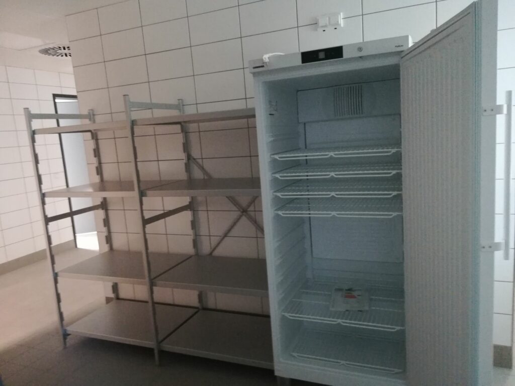 Das Lager ist mit stabilen Hupfer-Regalen ausgestattet, ergänzt durch einen Liebherr 2/1 GN Kühlschrank – ideal für strukturierte, sichere Lebensmittelaufbewahrung.