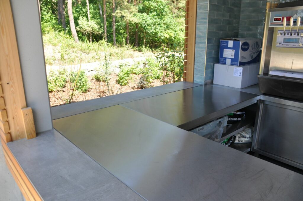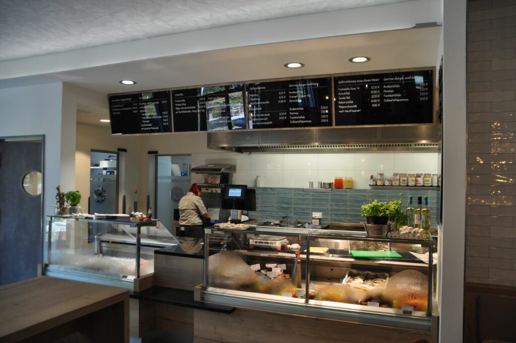 Die Fischbrötchen-Station wurde mit maßgefertigten Edelstahlmöbeln und Arbeitsflächen ausgestattet – funktional, langlebig und mit deutlich erweitertem Stauraum. Die Frischeauslage erfolgt in hochwertigen Kubus-Kühlvitrinen von KBS, die eine attraktive Produktpräsentation direkt am Gast ermöglichen.