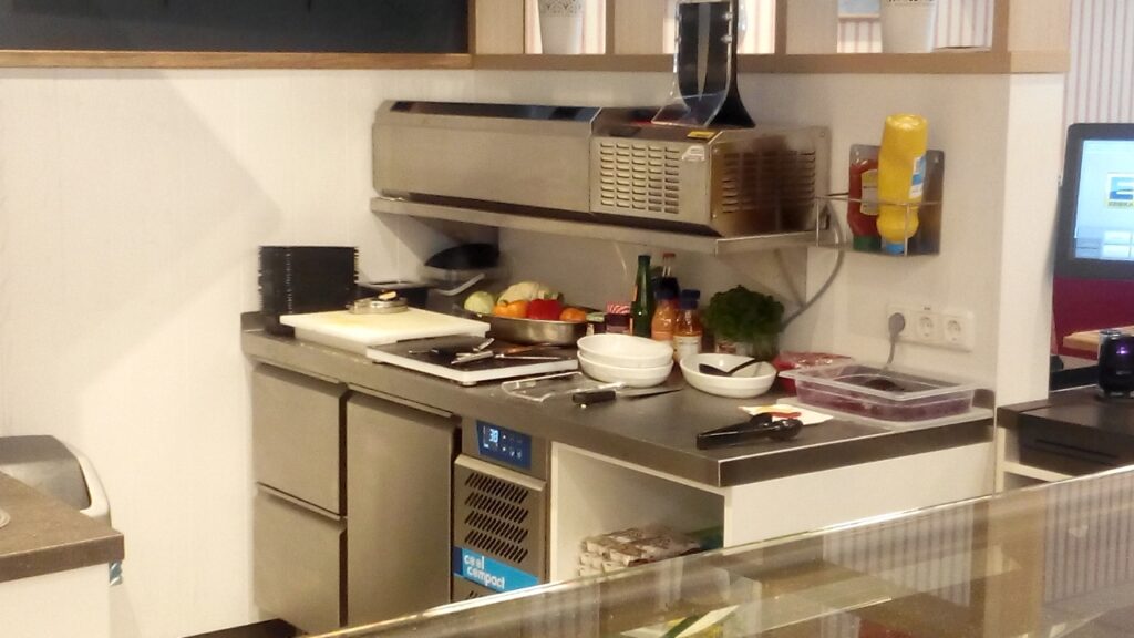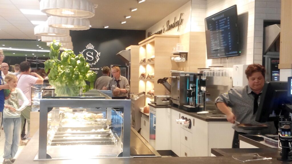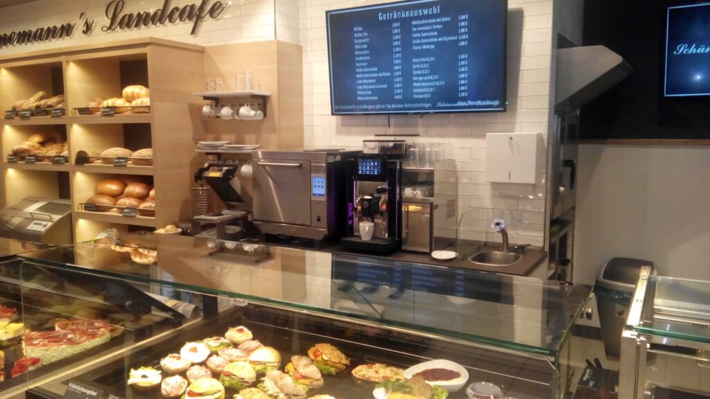Im Eingangsbereich des EDEKA-Marktes Schünemann in Bützow wurde ein modernes, einladendes Bistro realisiert – ausgestattet mit einer leistungsfähigen Warmausgabe sowie einer ansprechenden Kaltausgabe, ideal für den schnellen Genuss zwischendurch.