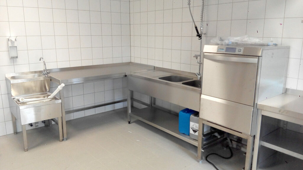 Die großzügige, individuell angepasste Edelstahl-Arbeitsfläche bietet nun viel Platz für Vorbereitung und Ausgabe, während die strukturierte Raumaufteilung den Mitarbeitenden ein effizientes Arbeiten ermöglicht.