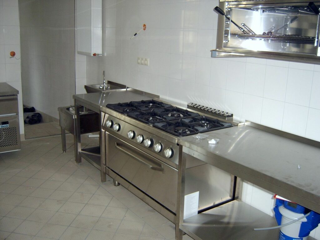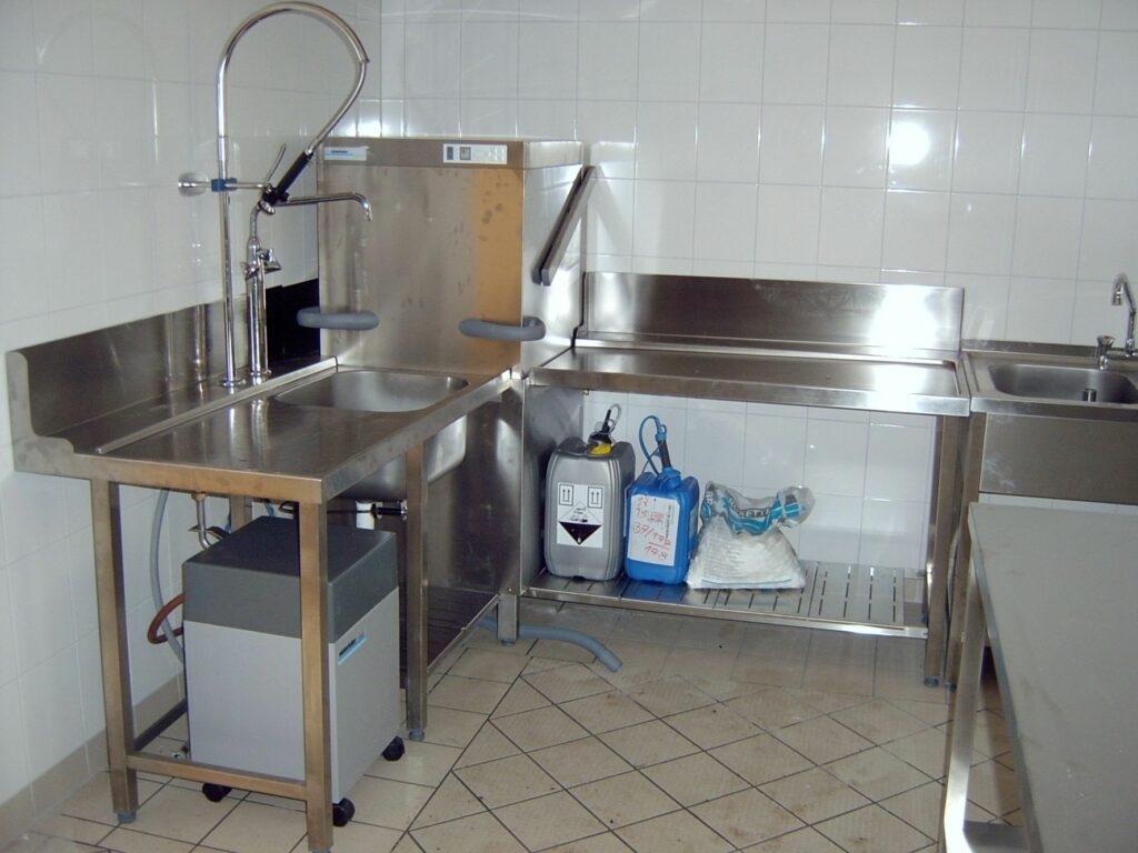Trotz beengter Verhältnisse wurde eine voll funktionsfähige Küche realisiert: Die große Kastenwandhaube in CleanLine-Ausführung wurde an einer Leichtbauwand befestigt. Ein leistungsfähiger Gasherd, ein kleinformatiger Kombidämpfer, ein Kühltisch sowie eine Spülmaschine über Eck bilden das technische Herzstück. Eine zusätzliche Wandhaube sorgt zuverlässig für Abluftabführung.