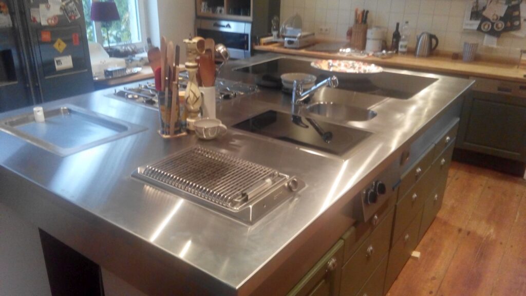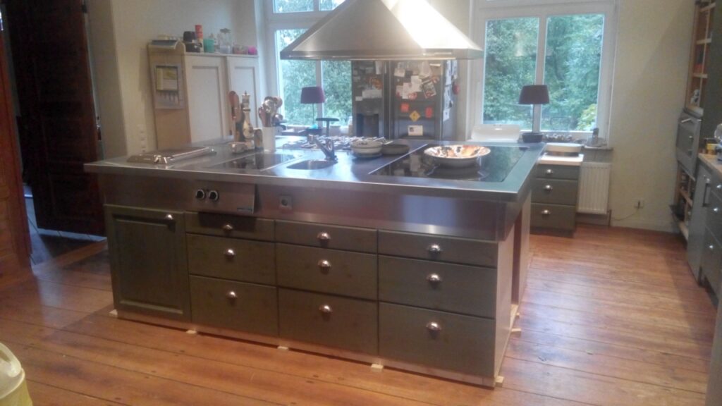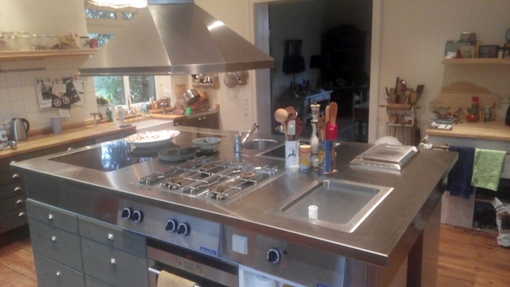 Im Jagdhaus wird in großer Runde gekocht – da braucht es nicht nur Platz, sondern auch durchdachte Technik. New Gastroline realisierte hier einen maßgeschneiderten Edelstahl-Kochblock, der die Ansprüche eines Privathaushalts mit der Funktionalität professioneller Küchentechnik vereint.