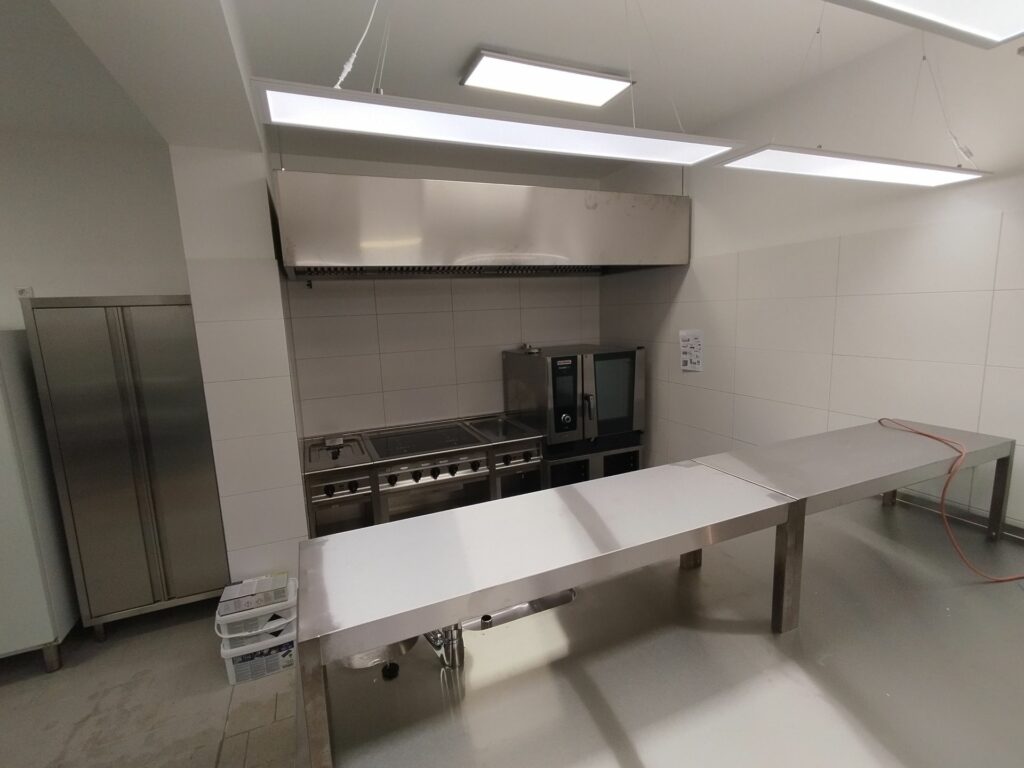 Ergänzt wurde die Küchenausstattung durch robuste Kühl- und Tiefkühlschränke, die auch bei größeren Anlässen zuverlässige Lagerkapazitäten bieten. Großzügige, hygienische Arbeitsflächen ermöglichen zudem ein angenehmes Arbeiten – auch bei gemeinsamer Essensvorbereitung im Team oder mit Gästen.