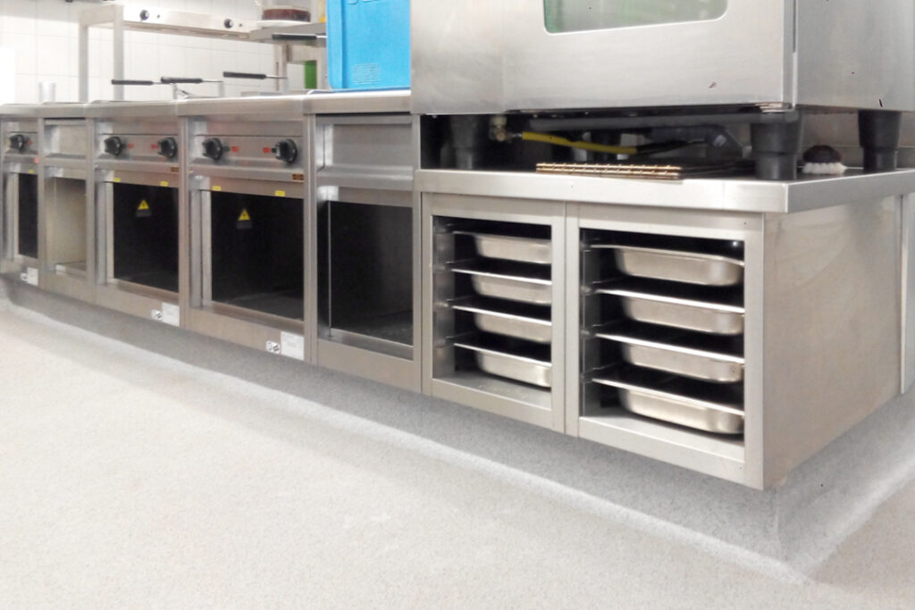 Zentraler Bestandteil ist ein neu gegossener Betonsockel, auf dem nun ein moderner Kochblock Platz findet. Der Sockel verhindert Schmutzansammlungen unter Geräten und Mobiliar – für dauerhaft einfache Reinigung und hygienische Bedingungen.