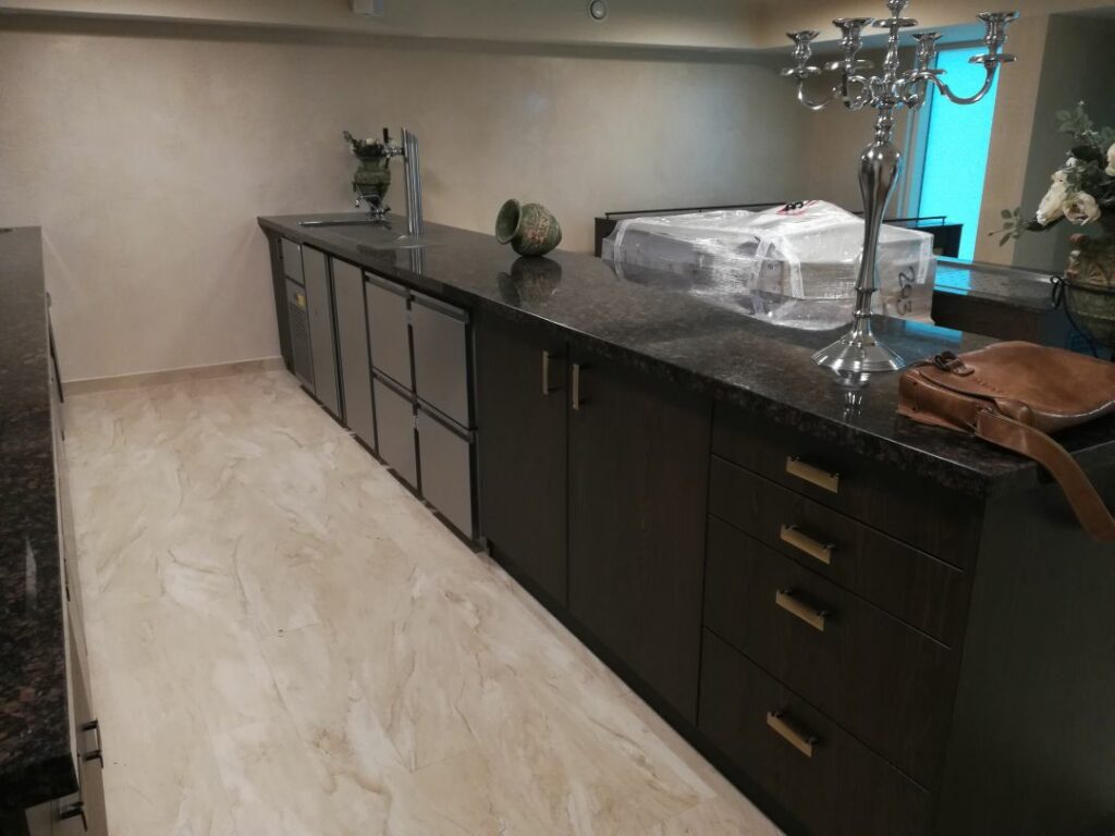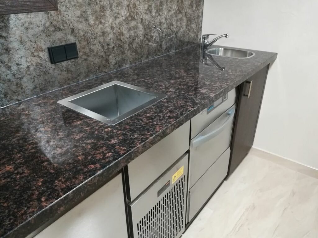 Auch im Barbereich wurde hochwertig ausgestattet: Der elegante Rieber-Tresen mit integrierter Getränketechnik schafft eine stilvolle Atmosphäre. Eine Winterhalter Gläserspülmaschine sorgt für hygienisch einwandfreie Reinigung im laufenden Betrieb – effizient und leise.