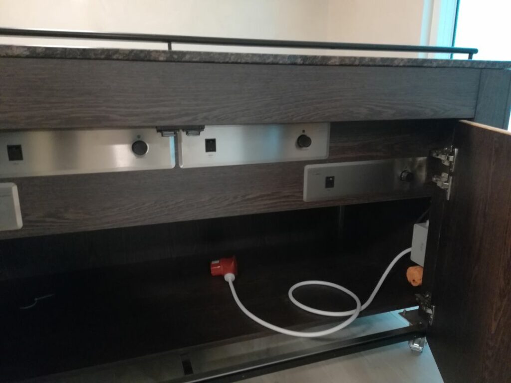 Kern der Küche bildet ein leistungsstarkes SelfCookingCenter SCC101 von Rational sowie eine Winterhalter Durchschubspülmaschine PT-M-Energy, beide mit Kondensationshauben ausgestattet – effizient, kompakt und energieoptimiert. Alle weiteren Geräte und Möbel wurden mobil ausgelegt, um größtmögliche Flexibilität bei Aufbau und Ablauf verschiedenster Events zu ermöglichen.