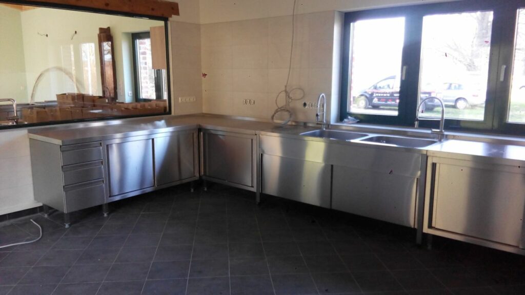 Zum Einsatz kamen großflächige Edelstahl-Arbeitsplatten, die durchgehend montiert wurden und eine komfortable sowie hygienische Verarbeitung ermöglichen. In die Planung integriert wurden Spülbecken an funktionsgerechten Positionen, um Reinigung und Zwischenarbeitsschritte nahtlos einzubinden.