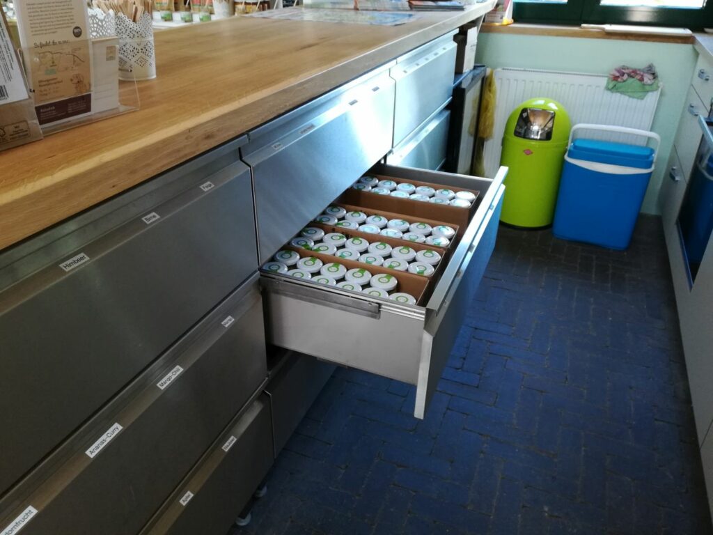 Besonderes Augenmerk galt dem Thema Lagerung und Organisation: Geschlossene Edelstahlunterbauten mit maßgefertigten Schubladenelementen bieten nun deutlich mehr Stauraum für die Vielzahl an Senfsorten – übersichtlich, leicht zugänglich und ergonomisch platziert. Das reduziert Suchzeiten und erleichtert den täglichen Arbeitsablauf spürbar.