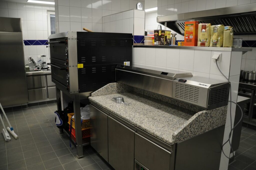 Eine halbhohe Wand trennt den Pizzabereich optisch und funktional ab. Hier steht ein Kühltisch mit Granitplatte für die professionelle Pizzavorbereitung bereit.