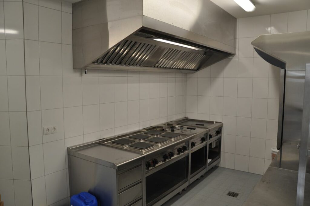 Der Kombidämpfer erhielt eine eigene Umluft-Ablufthaube, die ohne Außenanschluss auskommt – ideal bei eingeschränkten baulichen Möglichkeiten. Die Kochstrecke mit Elektroherd, Bräter und Fritteuse wird von einer CleanLine-Wandhaube erfasst, die dezent bis zur Decke verkleidet wurde.