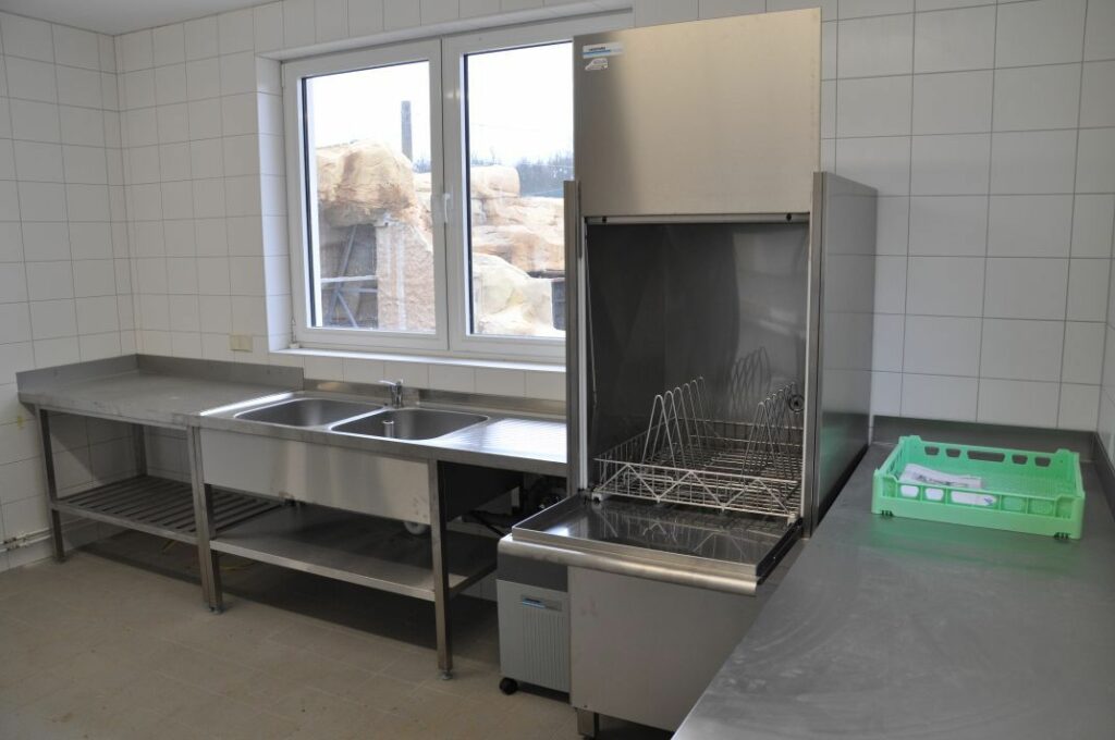 Zur Ergänzung der hygienischen Ausstattung kommen Wandhängeschränke mit Schiebetüren sowie eine leistungsstarke Gerätespülmaschine von Winterhalter zum Einsatz.