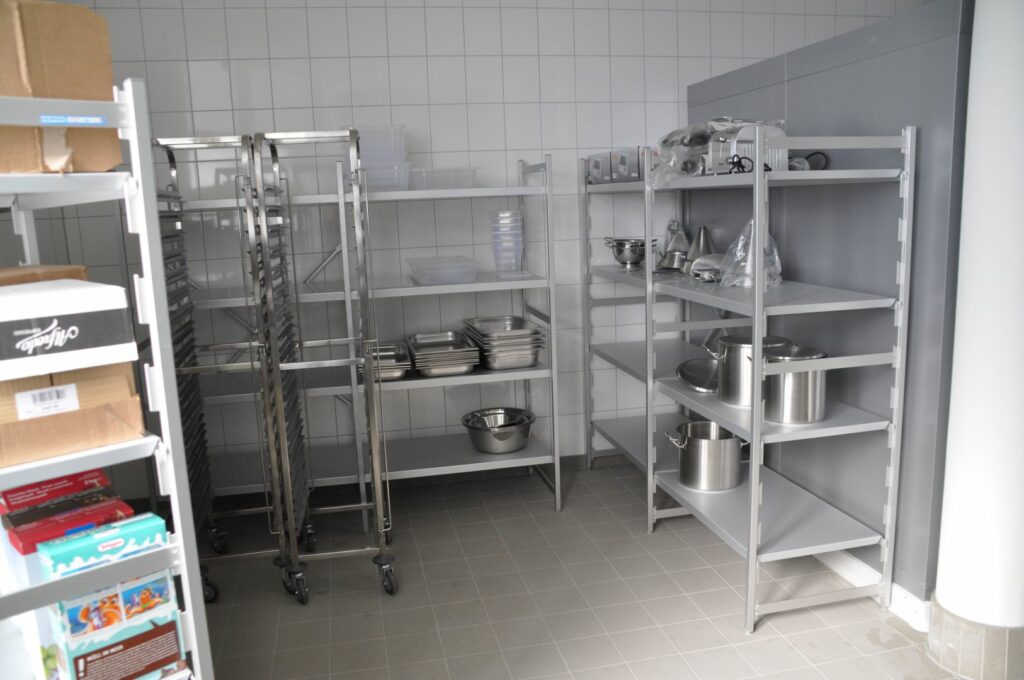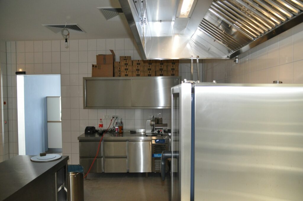 Die gesamte Arbeitsumgebung wurde mit robusten Edelstahl-Arbeitsflächen ausgestattet – langlebig, pflegeleicht und optimal auf die räumlichen Gegebenheiten abgestimmt. Ergänzend wurden Wandablufthauben in CleanLine-Ausführung installiert, ausgestattet mit geschweißter Fettrinne und integrierter LED-Beleuchtung – für beste Luftqualität und gleichmäßige, stromsparende Ausleuchtung der Arbeitsbereiche.